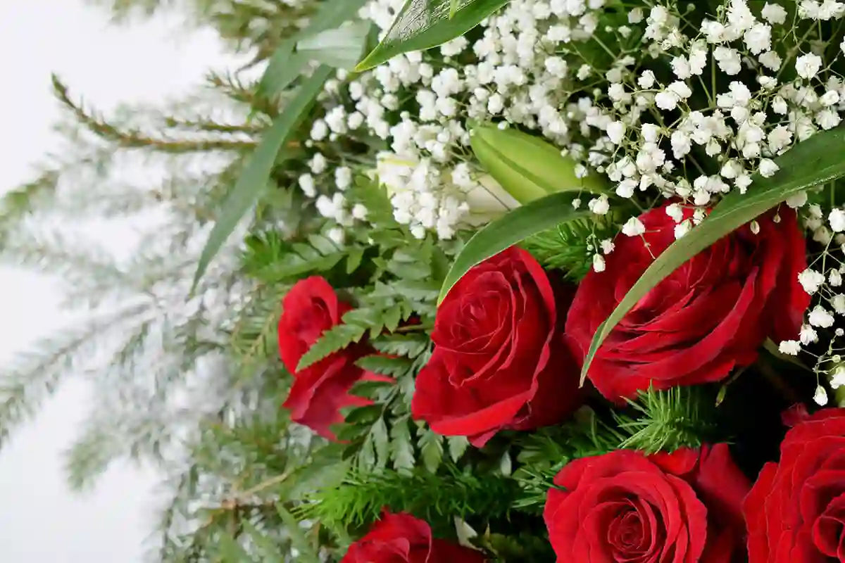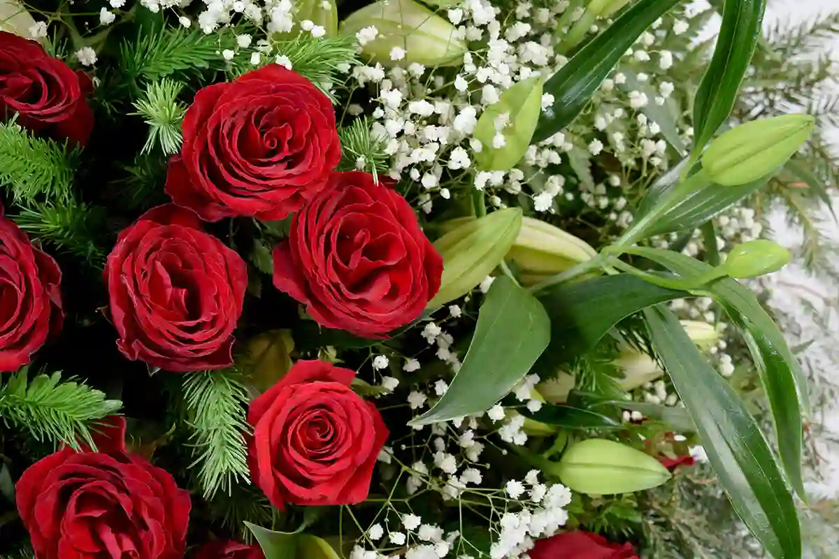 В основе траурного венка из живых цветов №18 лежат красные розы, символизирующие чистоту, невинность и уважение. Они окружены нежными зелеными растениями, что придаёт венку свежий и естественный вид. В верхней части венка расположены лилии.