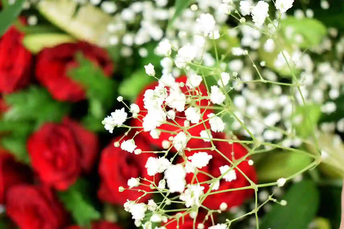 Розы аккуратно уложены, что создаёт гармоничное и эстетичное впечатление. Нежные детали, такие как гипсофила, добавляют легкости и воздушности.