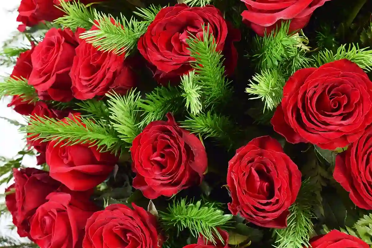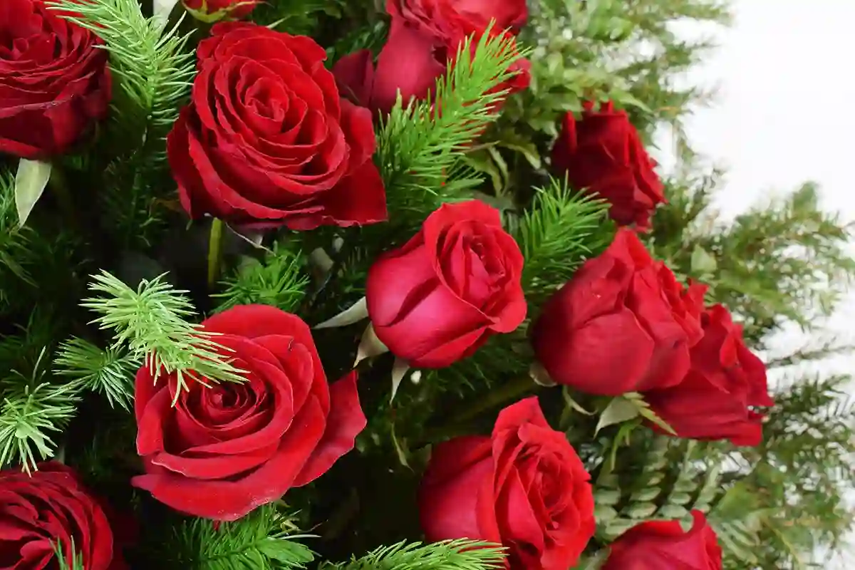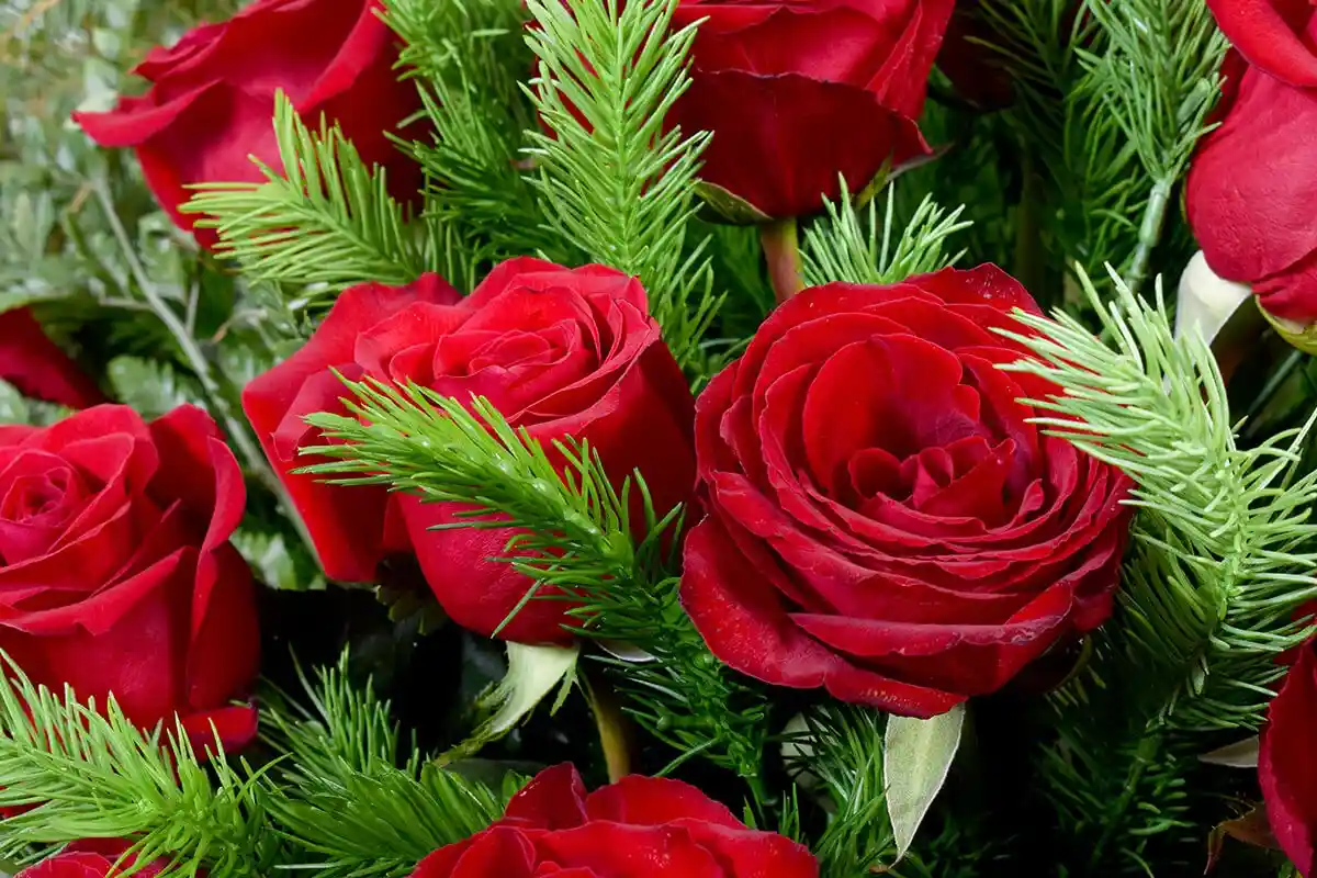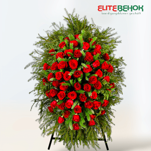 Эллипсоидная композиция с красными розами, которые являются центральным элементом. Розы аккуратно размещены и перемежаются ветками изумрудной еловой хвои.