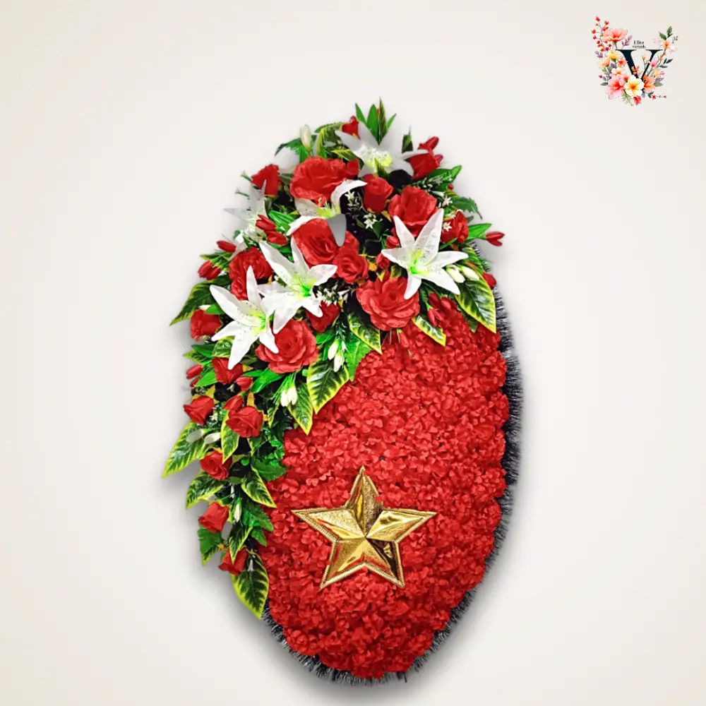 На изображении венок на возложение №1, выполненный из различных цветов и декоративных элементов. В центре венка преобладают ярко-оранжевые цветы, которые образуют плотное и насыщенное покрытие. Листвой с ярко-зелеными и жёлтыми листьями. В нижней части венка находится крупная золотая звезда. Она служит центральным декоративным элементом. Вся композиция выполнена в форме овальной или каплевидной рамки. И венок, предназначен для похоронных церемоний или памятных мероприятий.