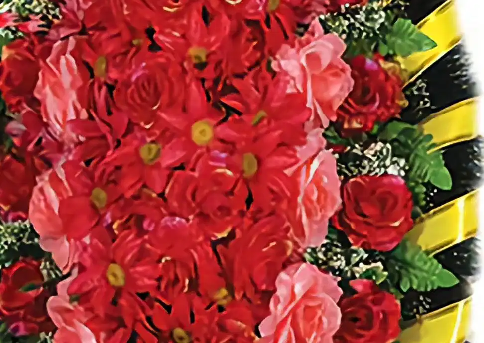 В похоронном венке “Стандарт” № 1 используются красные и роховые гвоздики. Они являются классическими символами скорби и любви, что делает эту композицию очень эмоциональной и трогательной. Обилие цветов, полностью закрывающих фон хвойной зеленью и листьями, создает впечатление объемности и насыщенности. Вмешательство гипсофилы добавляет легкости и грации этому венку, что придает ему особую изящность.